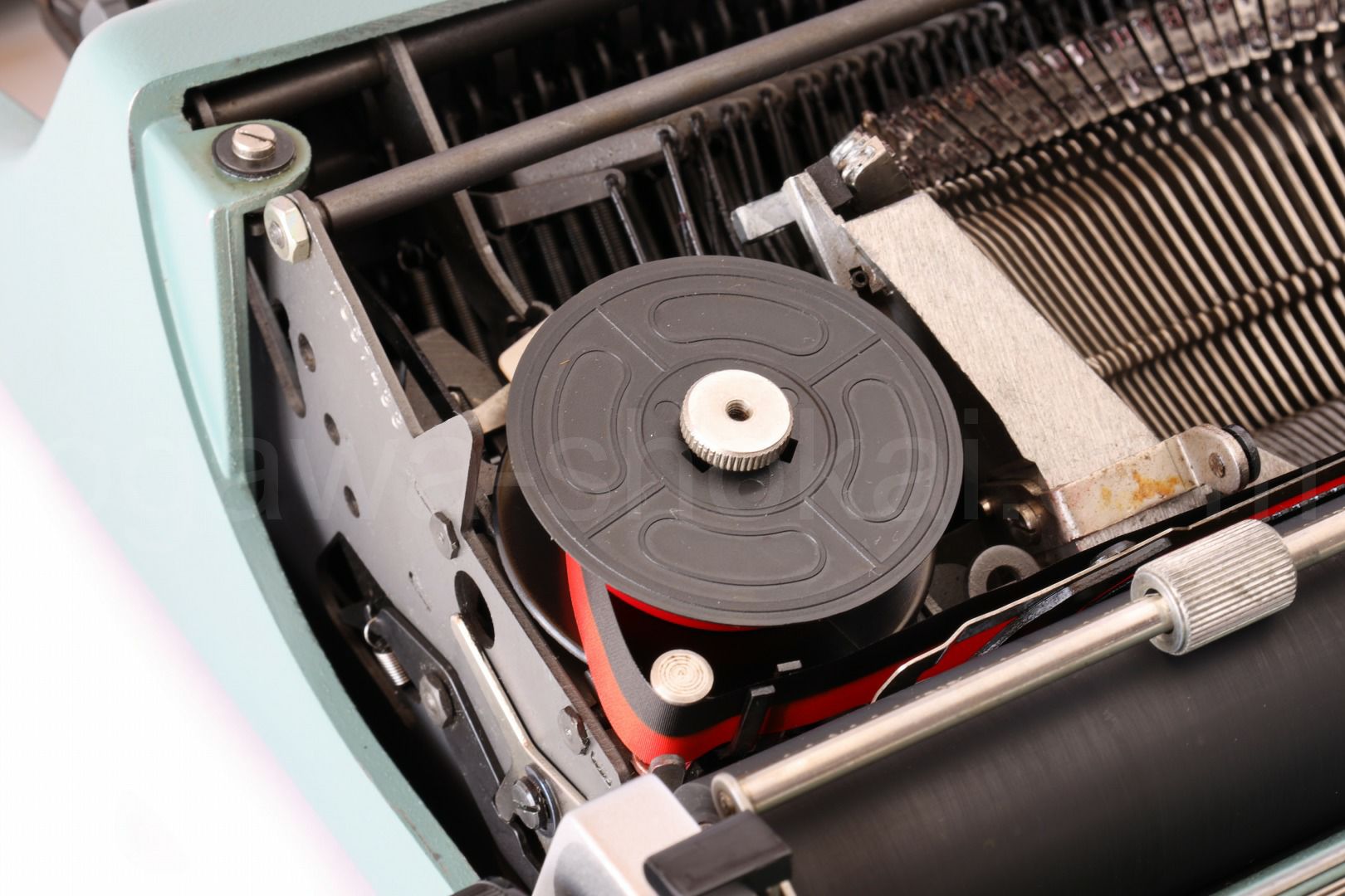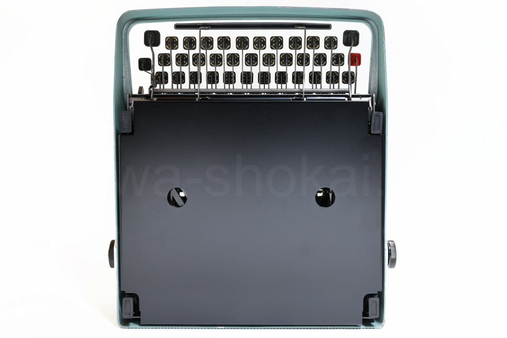 丹念にオーバーホール、クリーニングを行っているので不衛生ではありませんが、タイプライター本体は塗装落ちや傷が多めにある個体です。ここでは全体的なお写真では分かりにくい傷や汚れを中心にご紹介しています。全ての傷汚れを掲載することは困難なので目立つものを中心にご紹介しています。こちらでクローズアップしていない傷汚れがある場合もございますのでご承知おきください。再塗装されていない一般的な中古タイプライターレベルです(当店比較)。